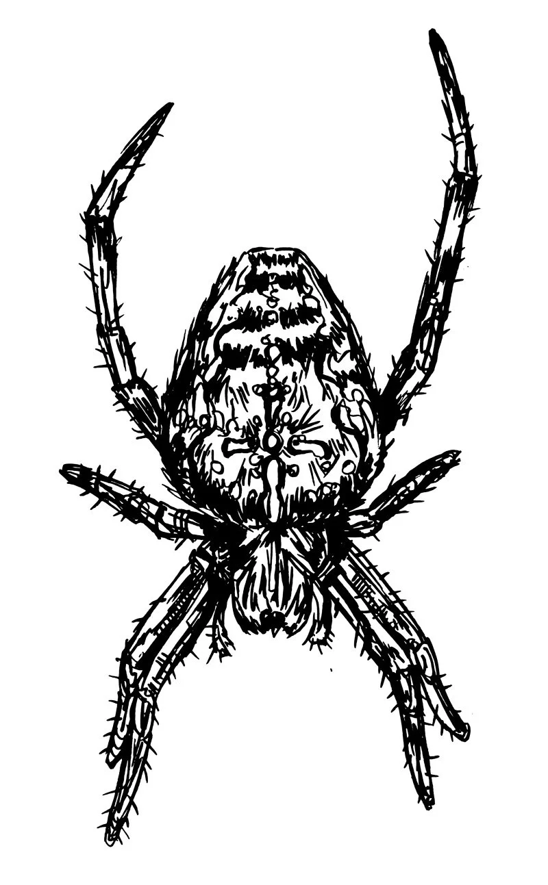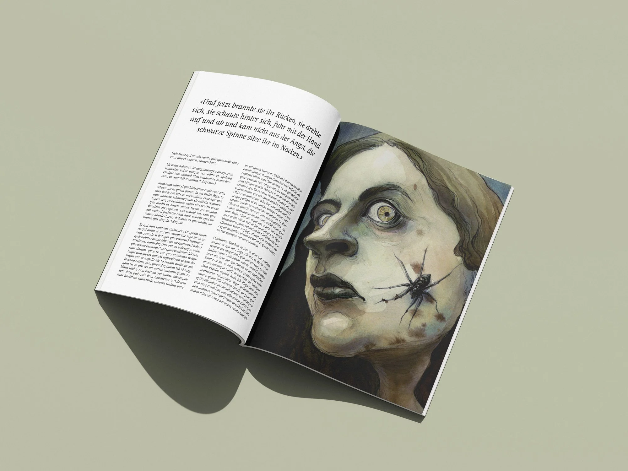Illustrationen zum Thema Spinne und Mensch, welche die Atmosphäre der Novelle “Die schwarze Spinne” von Jeremias Gotthelf aufgreifen.