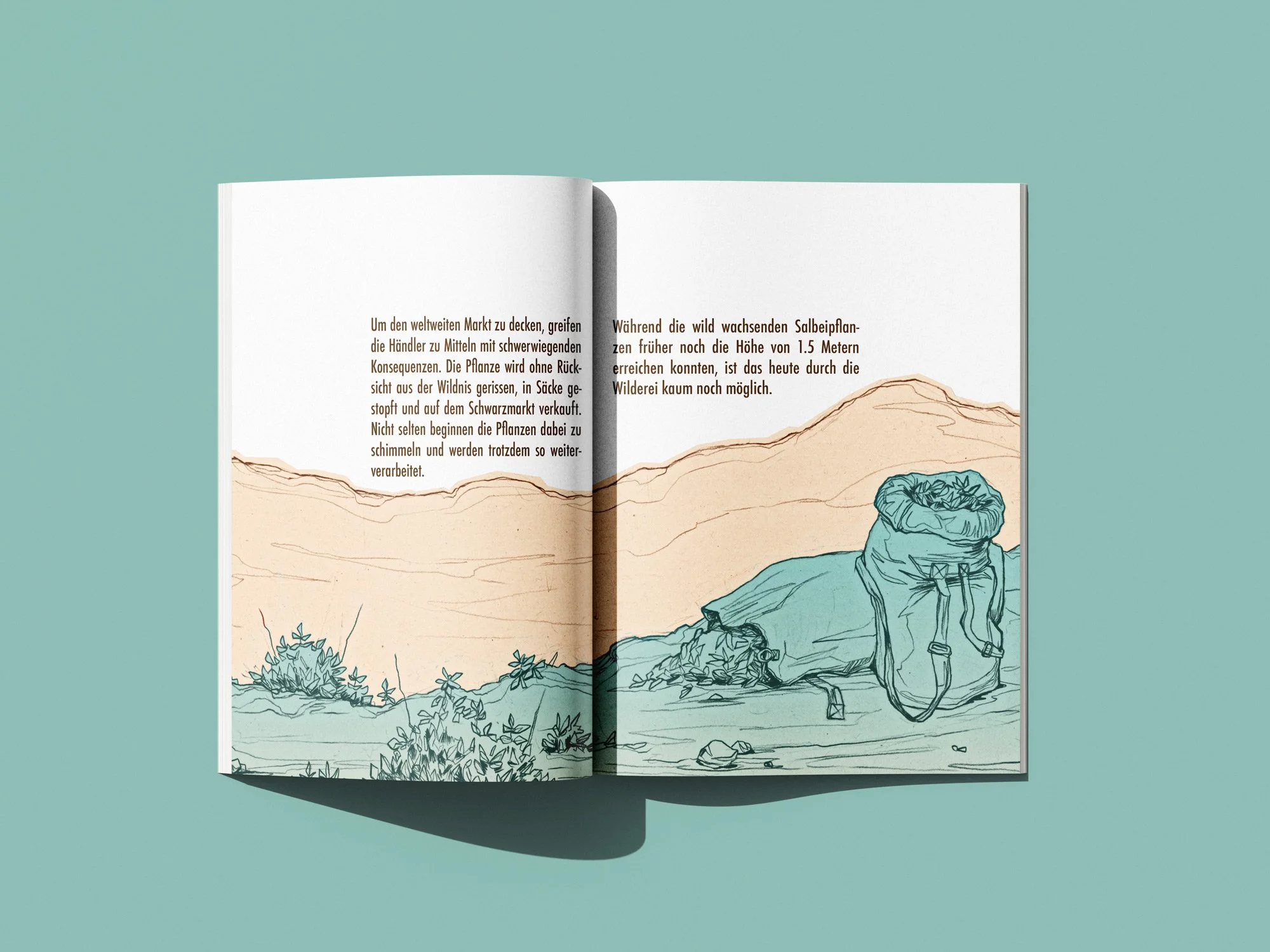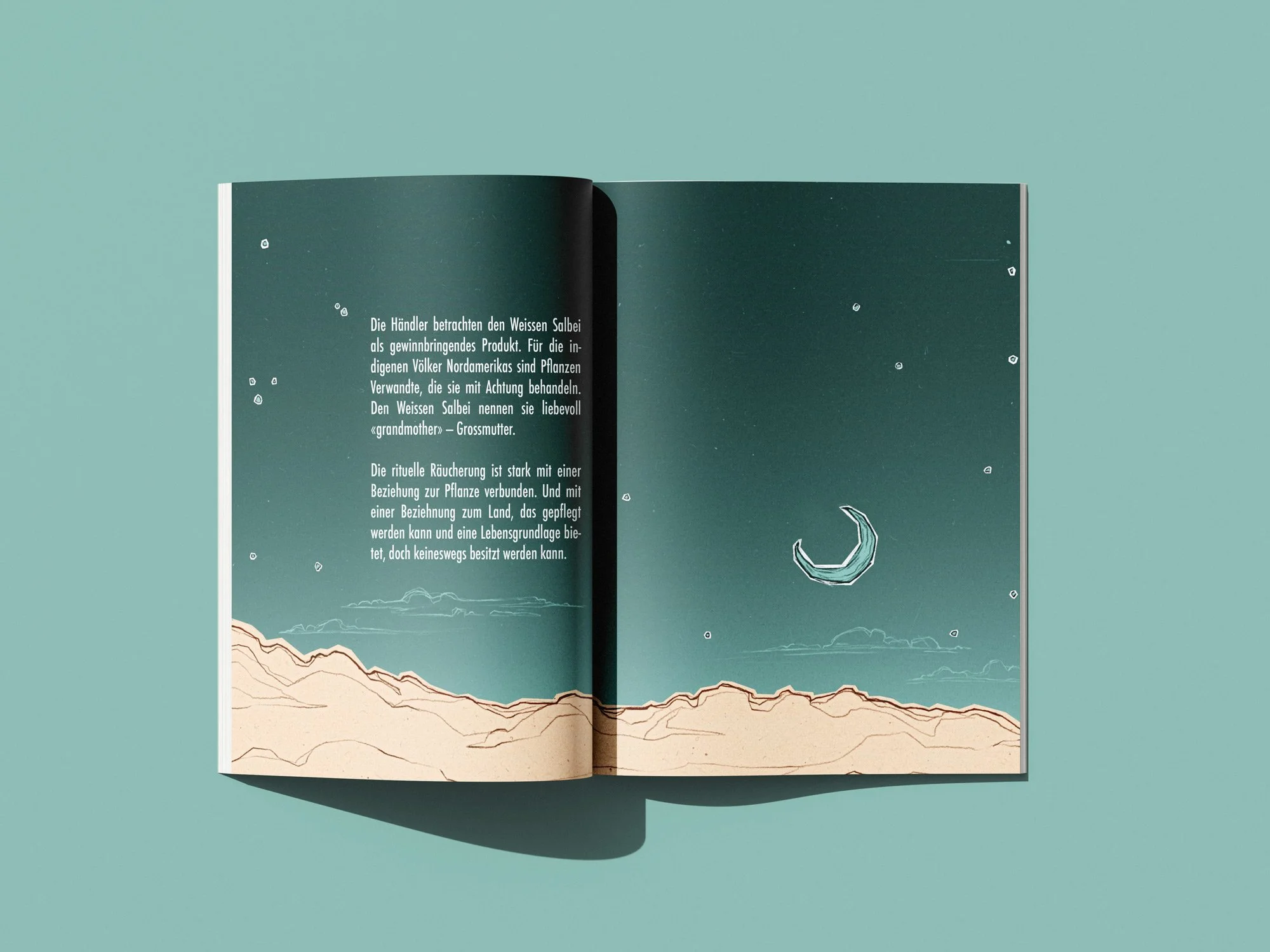 Dieses Booklet entstand im Rahmen des Studiums an der Hochschule Luzern in Zusammenarbeit mit dem NONAM, dem Nordamerika Native Museum in Zürich. Das Heft weist auf die Problematik der Kommerzialisierung des Weissen Salbeis als Räucherpflanze im Zusammenhang mit dessen Verwendung ausserhalb der indigenen Kultur Nordamerikas hin. Die Zeichnungen entstanden analog mit Bleistift und wurden anschliessend digital koloriert.